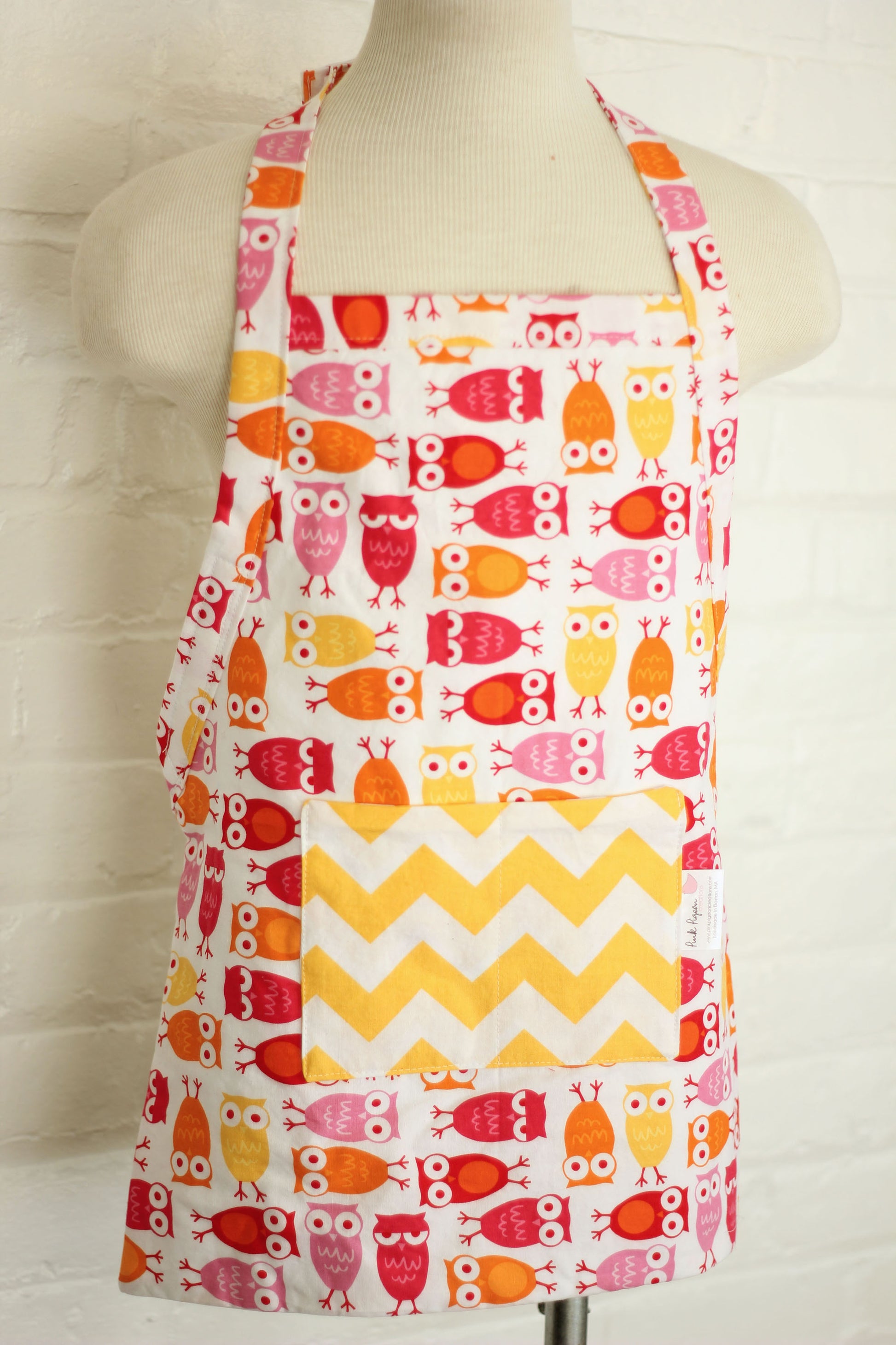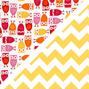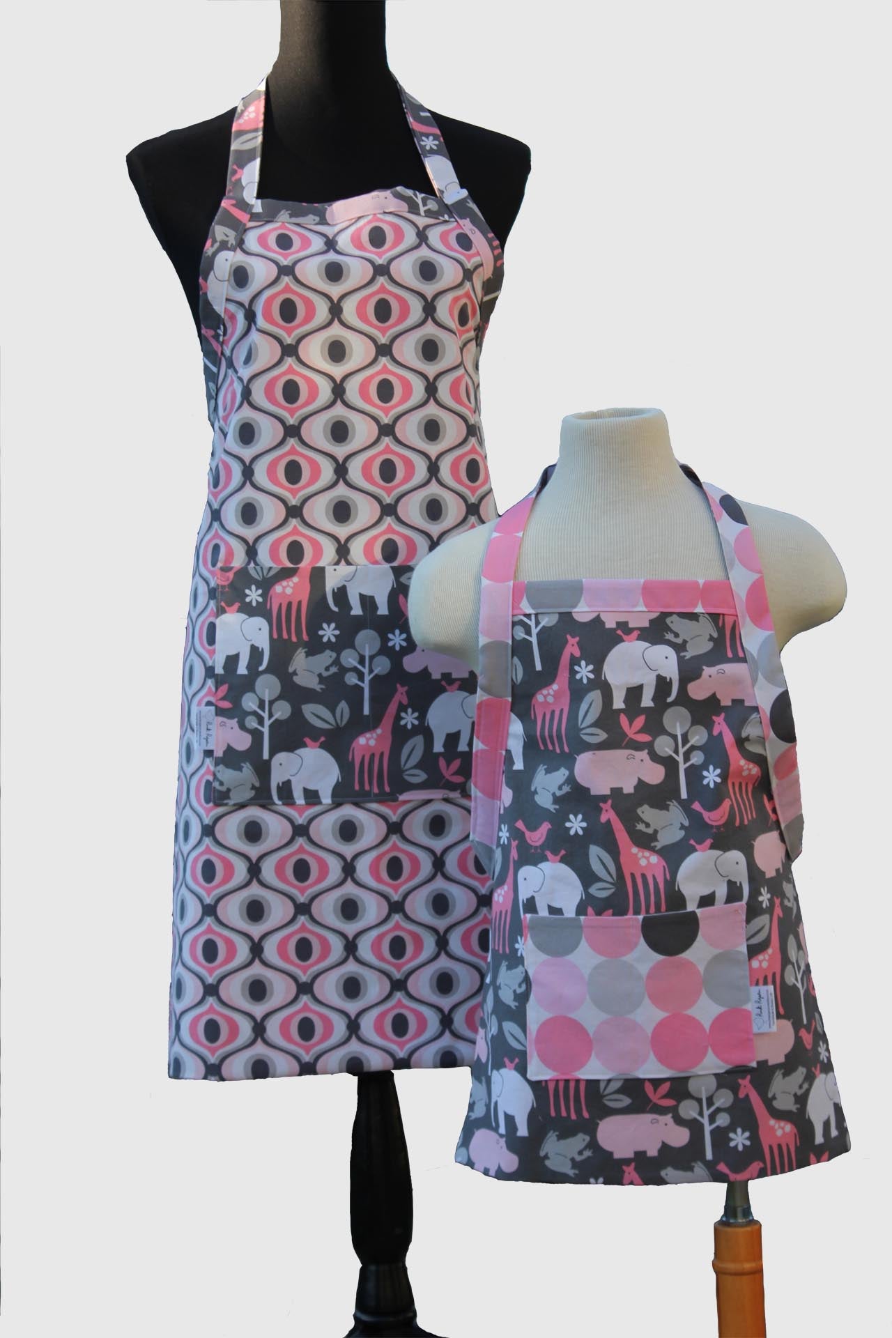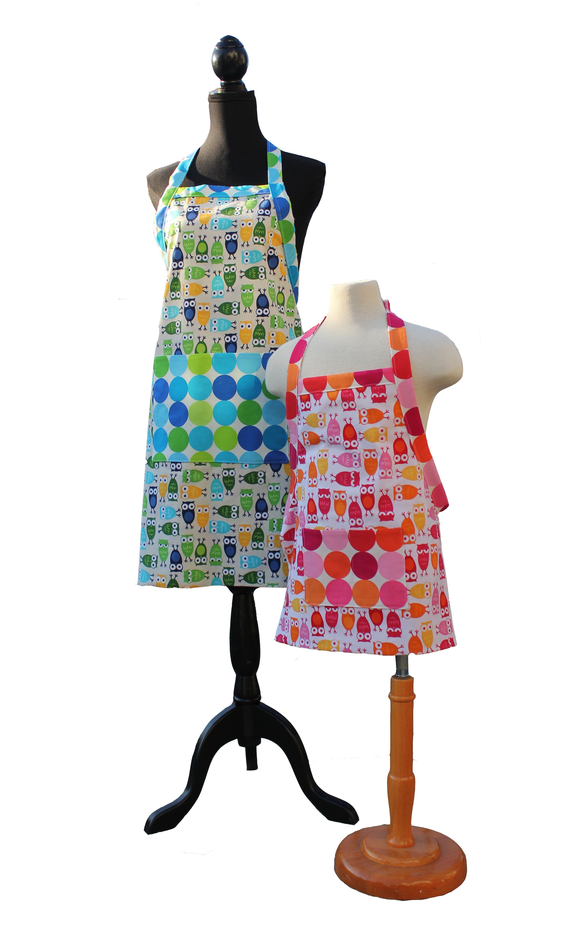 See photos for fabric combinations. The top left fabric is the body of the apron, with the lower right on the pocket and straps. Waterproof PUL on the back is white.